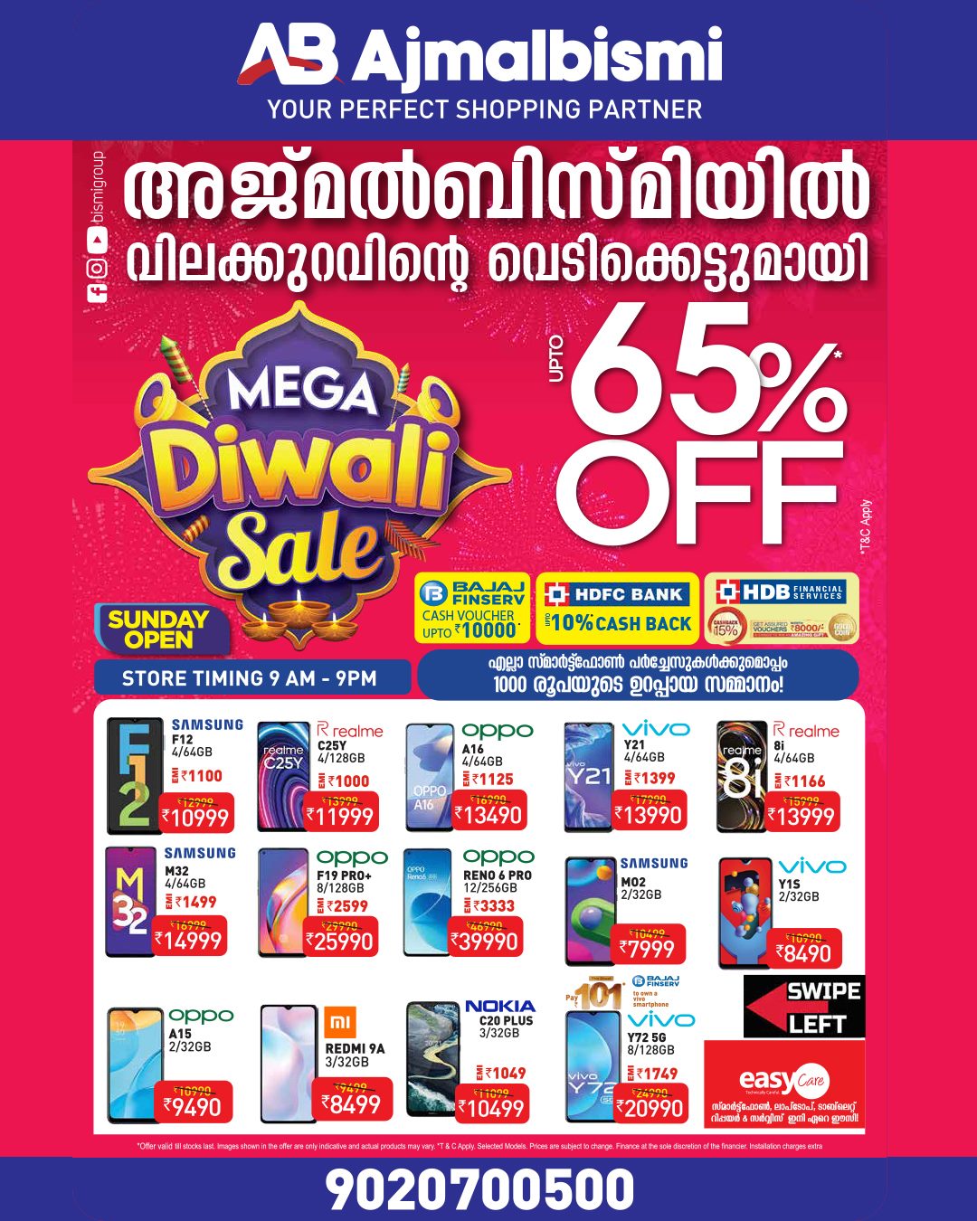 കോട്ടയം: സൗത്ത് ഇന്ത്യയിലെ ഏറ്റവും വലിയ റീട്ടെയില് ഗ്രൂപ്പായ അജ്മല് ബിസ്മിയില് 65% ഡിസ്കൗണ്ടുമായി ദീവാലി മെഗാ സെയില്.